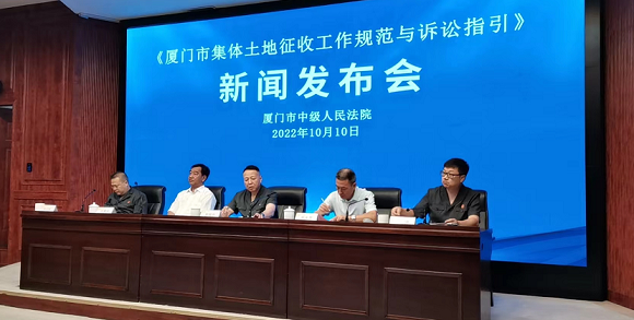 10月10日,厦门市中级人民法院发布了《厦门市集体土地征收工作规范与诉讼指引》(下称《征收指引》)。这是福建首份集体土地征收工作规范和诉讼指引,将成为一线集体土地征收工作人员手中一本教科书式的工作手册,将为厦门防范化解重大风险、保障经济高质量发展提供有力司法服务保障。当天,厦门市中级法院、市资源规划局、市司法局有关领导参加了发布会。