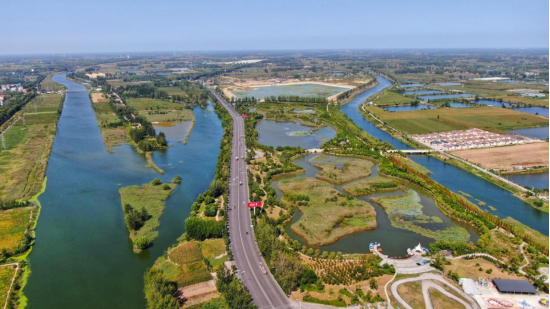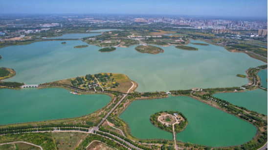 9月20日,航拍下的沱河湿地公园呈现出“水在绿中流、人在画中游”的壮美景观。孙海峰 摄