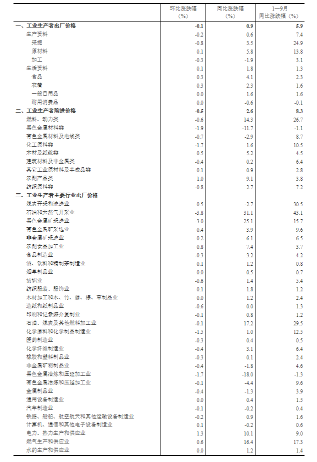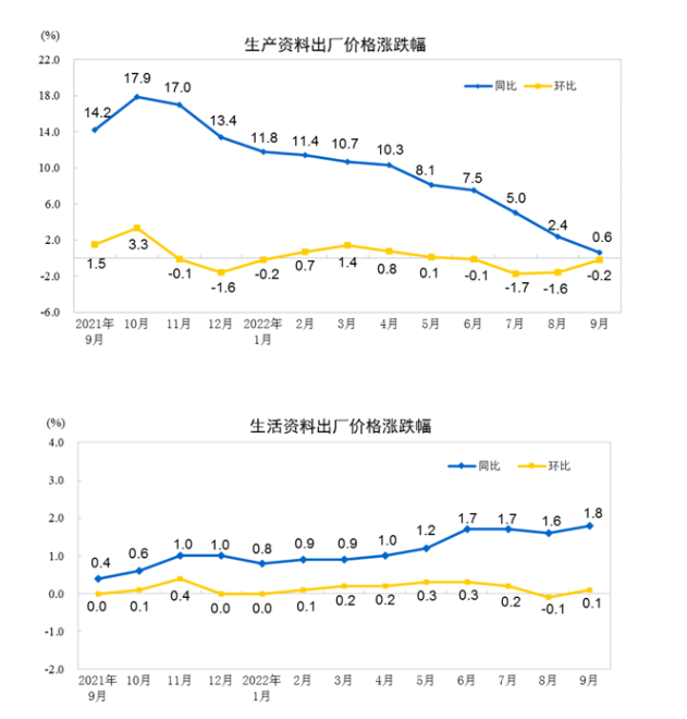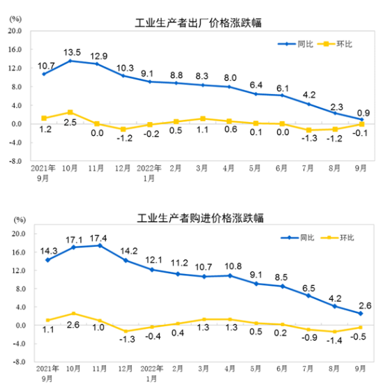 中国网财经10月14日讯 据国家统计局官网消息,2022年9月份,全国工业生产者出厂价格同比上涨0.9%,环比下降0.1%;工业生产者购进价格同比上涨2.6%,环比下降0.5%。1—9月平均,工业生产者出厂价格比去年同期上涨5.9%,工业生产者购进价格上涨8.3%。