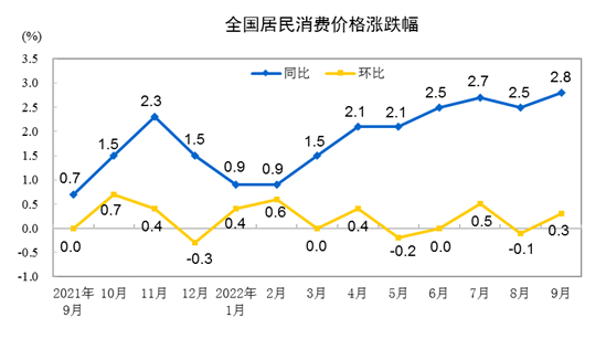 2022年9月份居民消费价格同比上涨2.8%环比上涨0.3%