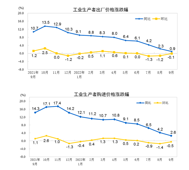 2022年9月份,全国工业生产者出厂价格同比上涨0.9%,环比下降0.1%;工业生产者购进价格同比上涨2.6%,环比下降0.5%。1—9月平均,工业生产者出厂价格比去年同期上涨5.9%,工业生产者购进价格上涨8.3%。