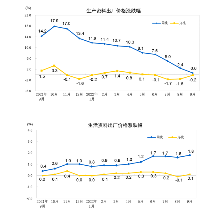 2022年9月份,全国居民消费价格同比上涨2.8%;2022年9月份,全国工业生产者出厂价格同比上涨0.9%,环比下降0.1%。
