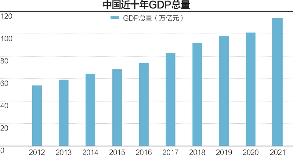 从关键经济指标看,这十年来,我国经济总量由2012年的53.9万亿元上升到2021年的114.4万亿元,占世界经济比重从11.3%上升到超过18%,人均国内生产总值从6300美元上升到超过1.2万美元。