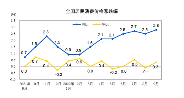 数据显示,9月CPI环比由上月下降0.1%转为上涨0.3%;同比上涨2.8%,涨幅比上月扩大0.3%,处于一年来最高水平,但弱于市场预期。