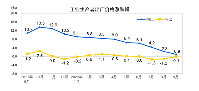 据测算,在9月份0.9%的PPI同比涨幅中,去年价格变动的翘尾影响约为1.3个百分点,新涨价影响约为-0.4个百分点。均比8月有所下降。