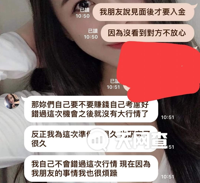 再看聊天内容。骗子一直是一副“专业”交易者的口吻,面对受害者朋友的怀疑也不急不躁。反而说:“你们自己要不要赚钱自己考虑好,错过这次机会之后就没有大行情了”。一句话下来,既显示了她的善解人意,又让受害者害怕错过这一波大行情。