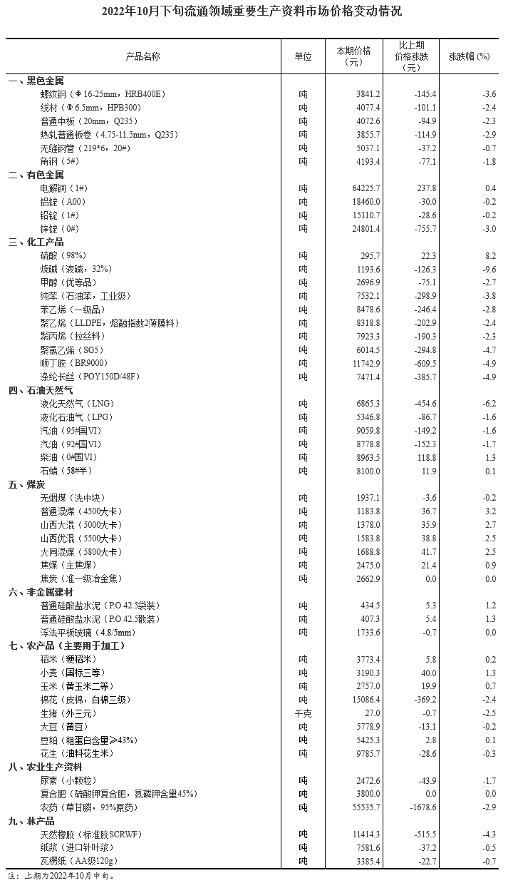 中新经纬11月4日电 4日,国家统计局网站公布2022年10月下旬流通领域重要生产资料市场价格变动情况。