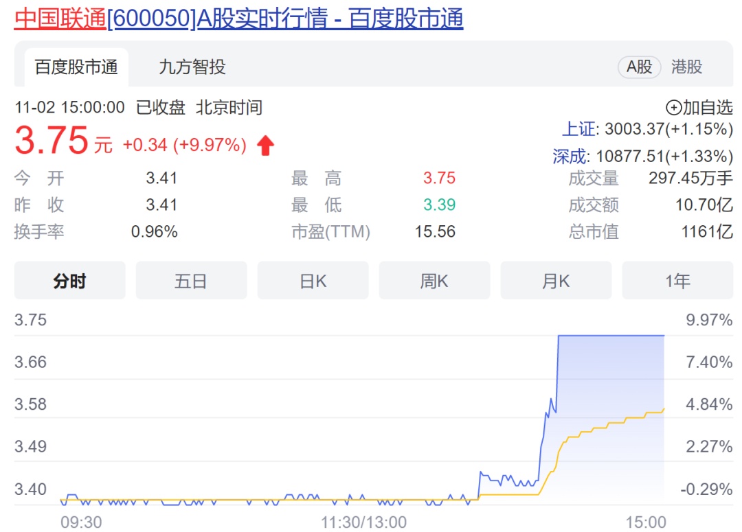 受此消息影响,中国联通午后开始放量拉升,不久后封涨停板,股价报收3.75元,涨9.97%。同时,中国联通也带动了通信概念股的异动拉升,中富通(300560)、北纬科技(002148)、宜通世纪(300310)、中国通脉等纷纷跟涨,而在港交所上市的腾讯因台风休市,股价表现尚未反映。