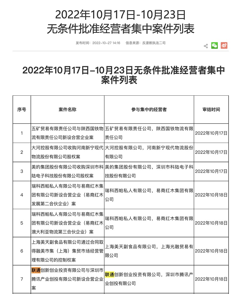 11月2日下午消息,据国家市场监管总局官网10月27日发布的《2022年10月17日-10月23日无条件批准经营者集中案件列表》显示,联通创新创业投资有限公司与深圳市腾讯产业创投有限公司新设合营企业案获无条件批准,审结时间为10月18日。
