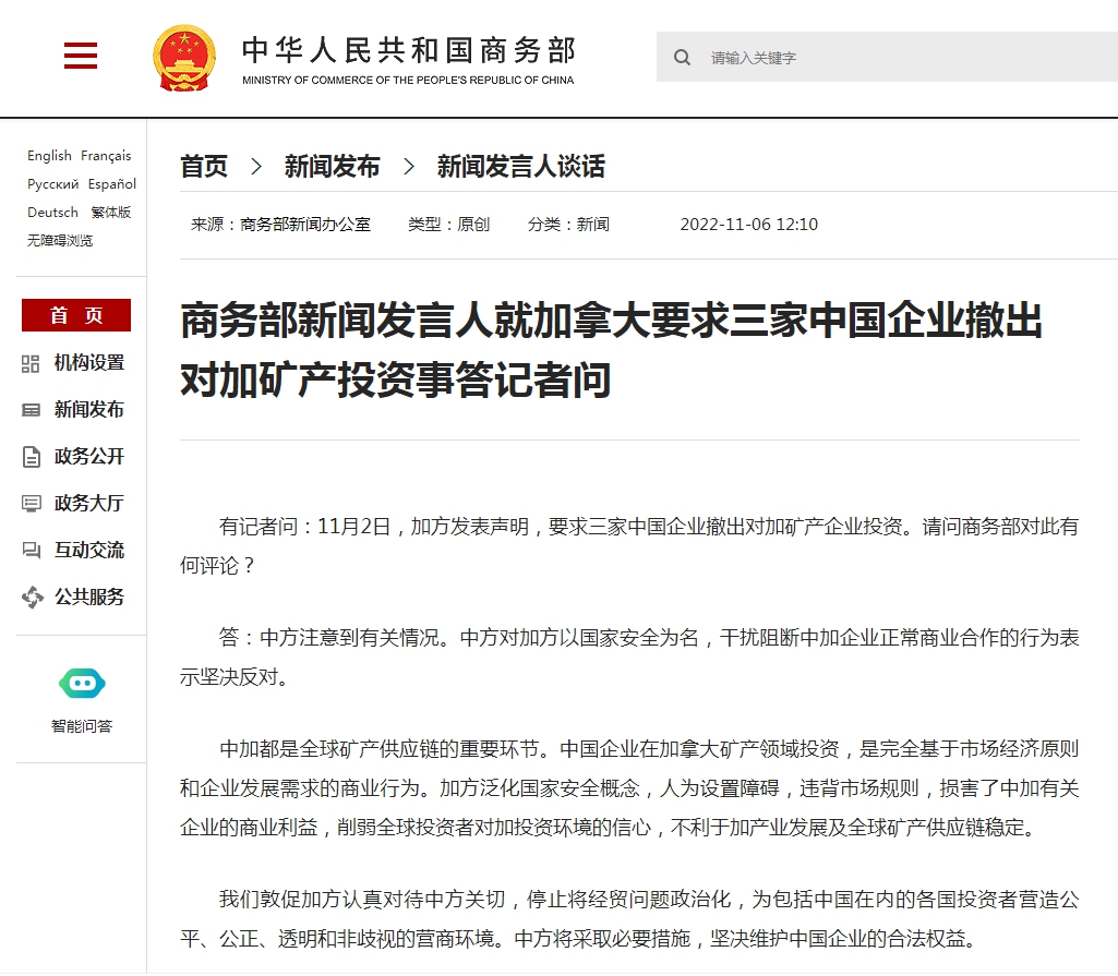 有记者问:11月2日,加方发表声明,要求三家中国企业撤出对加矿产企业投资。请问商务部对此有何评论?