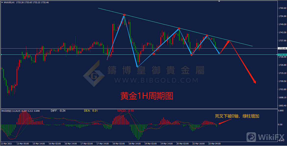 从下方的黄金1H周期图可以看出,昨日黄金在亚盘进行下跌,最低到达下方关键支撑1728附近后于每盘期间反弹到1740附近,当前黄金承压于上方压力线再次进行回调。目前黄金依旧处于三角调整区间当中。从MACD指标上来看,当前DIFF和DEA线即将下破0轴,且空头动能柱有递增的趋势,说明目前黄金有转空头的趋势,建议在黄金再次反弹到上方压力线附近后布局空单。