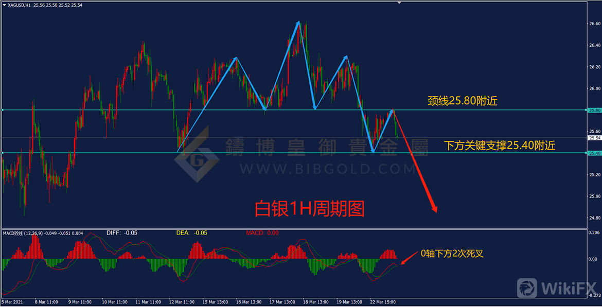 从下图白银1小时图来看,白银在此前连续上涨后,形成头肩顶的顶部形态。昨日,白银在向下跌破颈线25.80附近后,再次反弹颈线附近进行确认。当前白银受到上方压力后再次回落,证实了此前头肩顶形态的有效性。且指标方面,MACD出现0轴下方DIFF以及DEA线的二次死叉,预计后市大概率加速下跌,建议白银日内操作以做空为主。