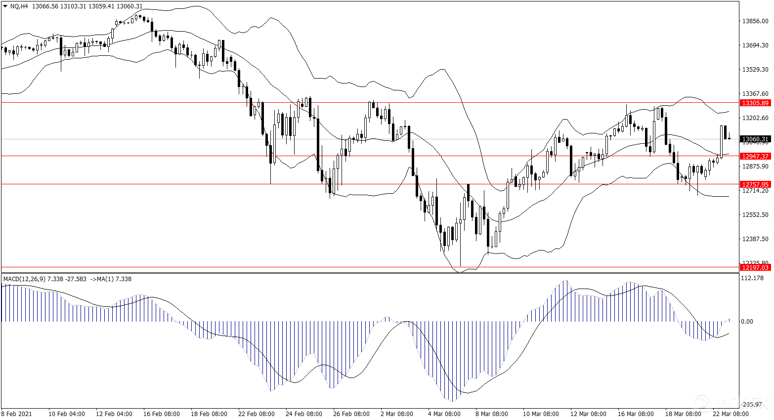 纳指短线突破12950关键压力,理论上上方偏多,而关键压力是13300附近。指标看布林线开口横盘,而MACD低位金叉,似乎多头动能还是存在。交易策略上关注下方支撑有效性,尝试逢低多思路,跌破支撑多头离场。