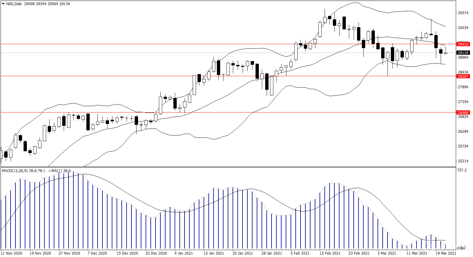 日经指数在触及日线图布林线下轨支撑28730附近反弹,短线第一压力是布林线中轨压力29450附近。指标看布林线开口横盘,而MACD在0轴位置徘徊,短线方向不明。交易策略尝试高抛低吸思路,突破则反手做追单。