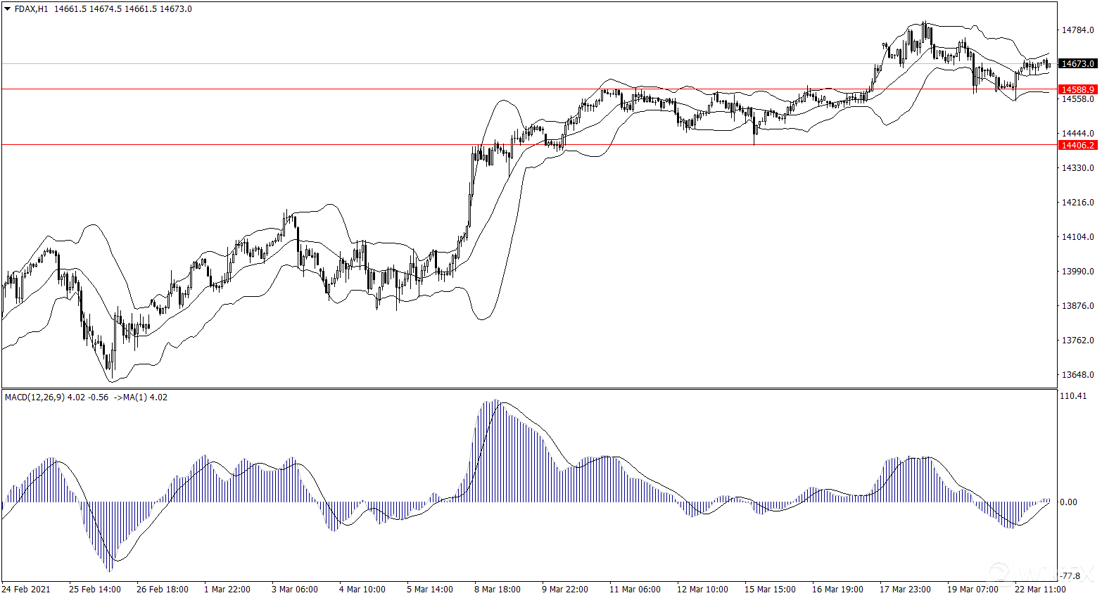 德指昨日测试14550附近支撑后反弹,该位置是鉴别德指强弱的分界点位,上方压力是14780附近。指标看布林线开口横盘,而MACD在0轴位置徘徊,所以德指方向不明。交易策略上投资人可以尝试逢低多,搏支撑的有效性,破位则采取反手空交易。