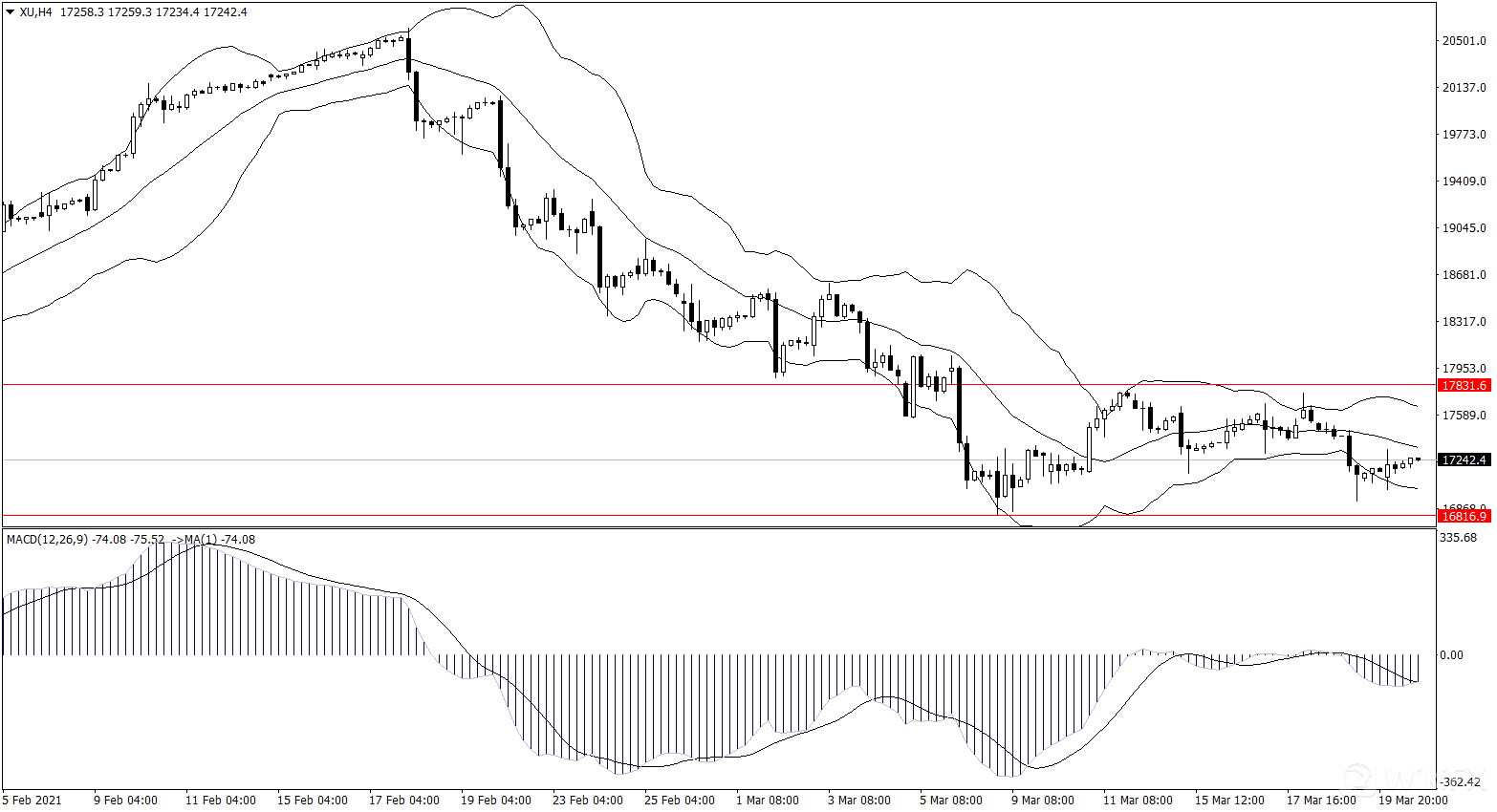 形态看A50指数第一压力就是17380附近,突破则看17660,短线支撑是17000附近。指标看布林线开口横盘,而MACD指标低位徘徊,短线方向不明,所以A50目前不一定能有效突破上方压力。交易策略突破前可以尝试高抛低吸交易,突破后采取追单策略。