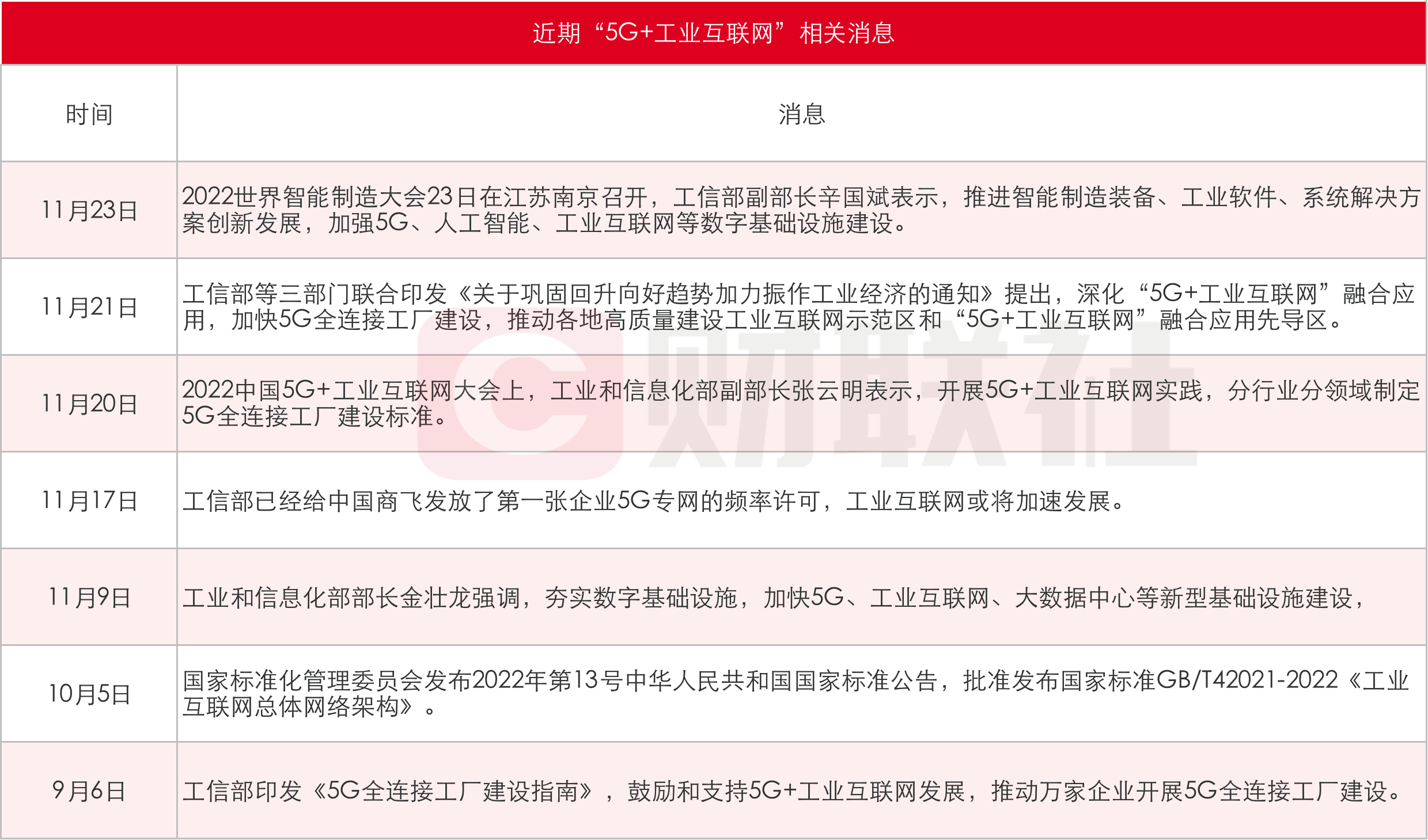 值得注意的是,据财联社不完全梳理,近期“5G+工业互联网”相关利好消息不断。
