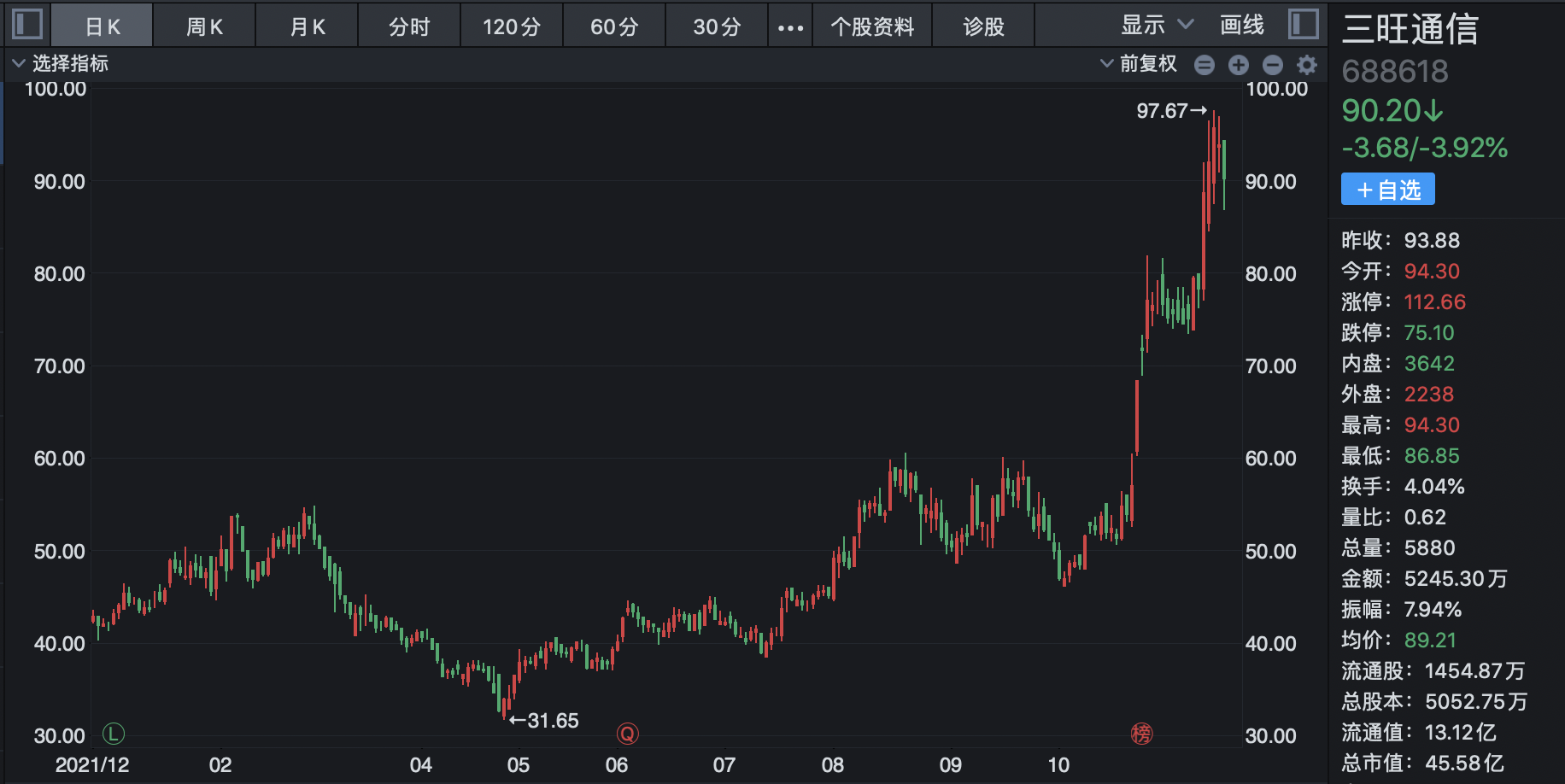二级市场表现来看,自10月底迄今,三旺通信、中新赛克(002912)、太极股份(002368)、中科江南等工业互联网相关个股股价均已翻倍,其中,三旺通信年内累计最大涨幅达208.59%。