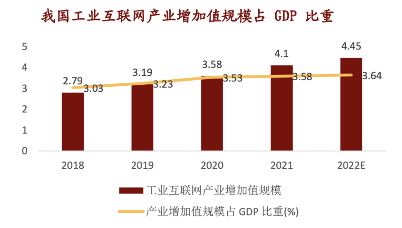 根据《中国工业互联网产业经济发展白皮书》预计,2022年我国工业互联网产业增加值规模将达到4.45万亿元,占GDP比重将上升至3.64%。