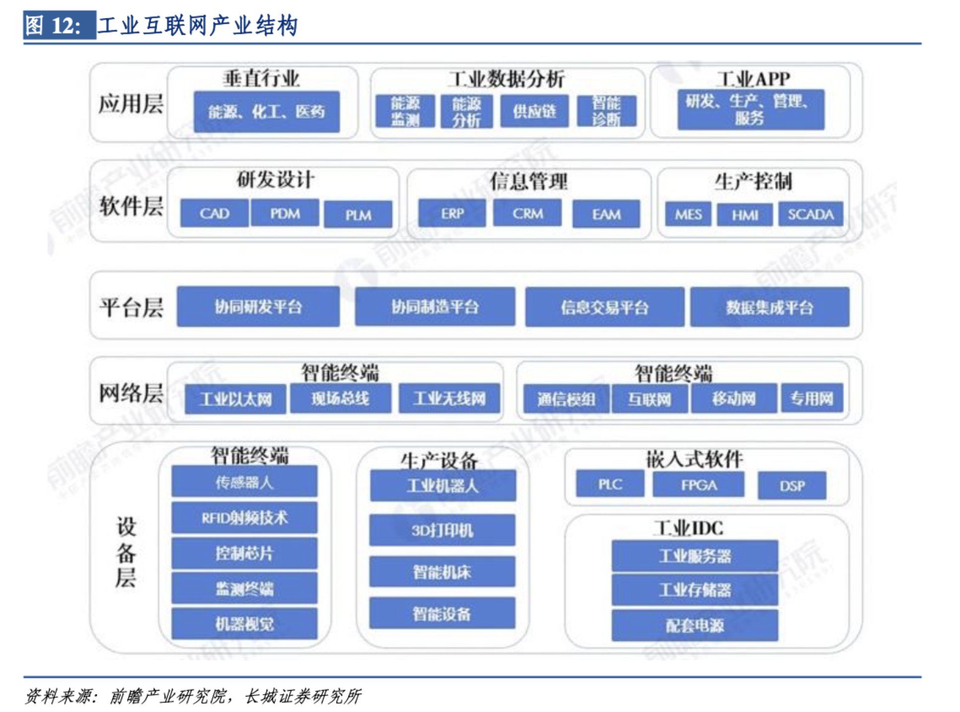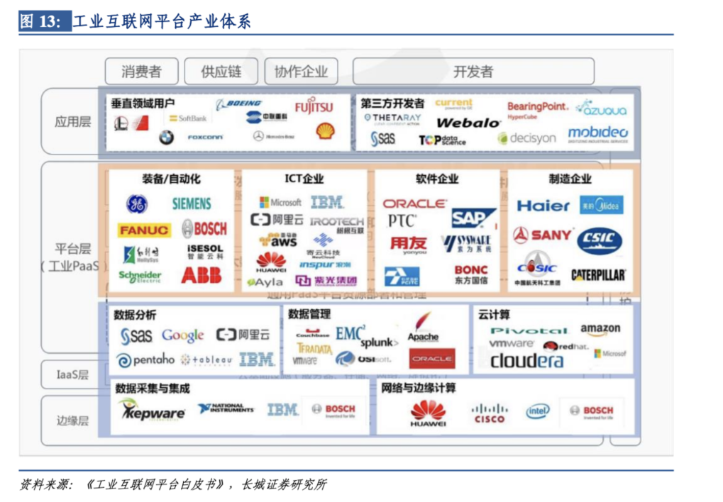 在工业互联网产业链中,上游主要是智能硬件设备和软件的设备提供商,中游为互联网平台,下游是工业互联网应用场景的工业企业。