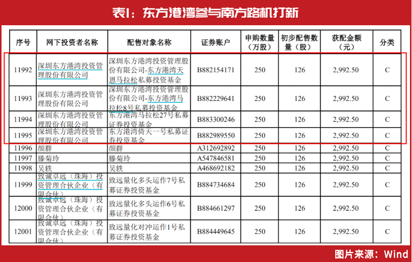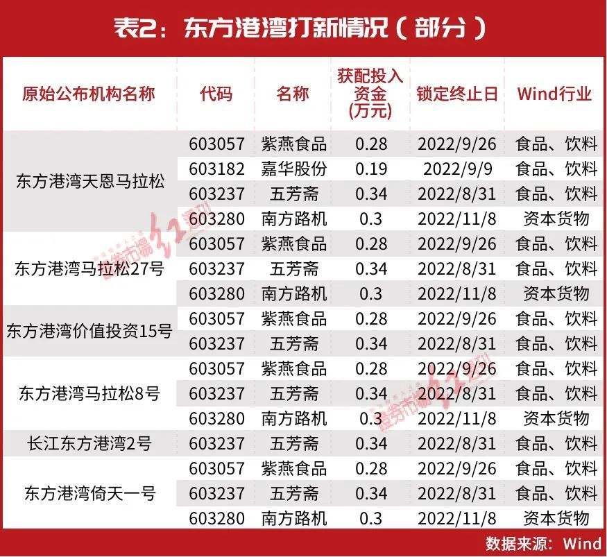 南方路机只是但斌名单中的冰山一角。在近三个月中,但斌还参与了紫燕食品、五芳斋、嘉华股份等个股的打新。不过,整体获配金额也均维持在较低水平,如9月26日上市的紫燕食品,东方港湾天恩马拉松共获配投入资金0.28万元,其他基金如东方港湾马拉松27号、东方港湾价值投资15号、东方港湾马拉松8号、东方港湾倚天一号等获配单只个股的金额也均在1万元以下(见表2)。
