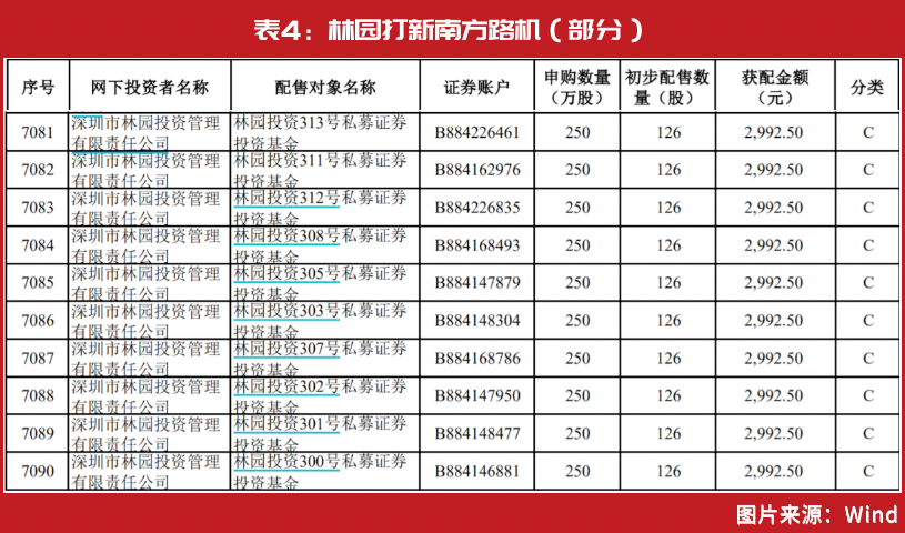 相较于但斌,林园在打新方面的投入力度更大。以最近上市的南方路机为例,但斌4只基金参与打新,共动用2.3亿元。林园投入打新的基金数量则多达近200只(见表4),累计动用资金则超过百亿。