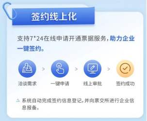 在签约线上化上,系统可自动完成签约信息登记,并向票交所进行企业信息报备,实现7*24小时在线申请开通票据服务的全天候支持,助力企业一键签约。
