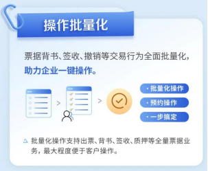 渤海银行新一代票据系统还支持出票、承兑、贴现、背书、签收、质押等全流程服务,多种交易行为皆可全面批量化操作或预约办理,一步搞定,助力企业一键操作。