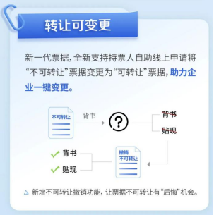 系统还全新支持持票人自助线上申请将“不可转让”票据变更为“可转让”票据,新增不可转让撤销功能,助力企业一键变更。此六大特色功能不仅解决了企业用票的多项痛点问题,还从票据全生命周期的各个环节中提升了企业用票体验,降低操作风险。