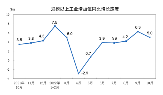 10月份,规模以上工业增加值同比实际增长5.0%(增加值增速均为扣除价格因素的实际增长率)。从环比看,10月份,规模以上工业增加值比上月增长0.33%。1—10月份,规模以上工业增加值同比增长4.0%。