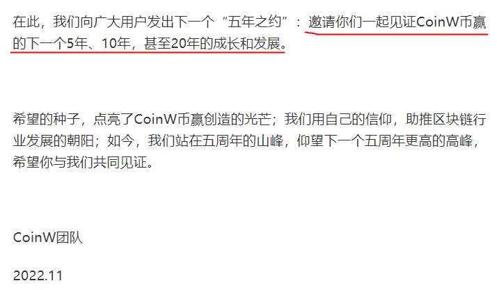 从4月至今,这套安抚话术还在用。11月初,它又发布了《CoinW币赢五周年 致行业用户的公开信》。信中要“家人们”一起见证CoinW币赢的下一个5年、10年。但七个月的时间账户无法解封、无法提现的问题不是只有一例,所以,不管它再怎么安抚,已经有越来越多的用户相信CoinW是想跑路了。毕竟,有很多资金盘跑路前都找过“系统升级”的借口,请投资者们千万不要再进入CoinW币赢投资。