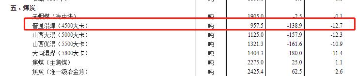 煤炭方面普遍下跌,普通混煤(4500大卡)降幅最大,达12.7%,本期价格为957.5元/吨。山西大混(5000大卡)下降12.3%,本期价格为1125元/吨。