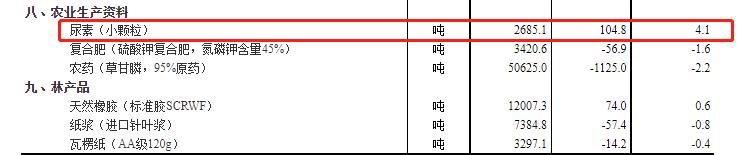 生猪(外三元)降7.4%,本期价格22.5元/千克。尿素(小颗粒)涨4.1%,本期价格2685.1元/吨。