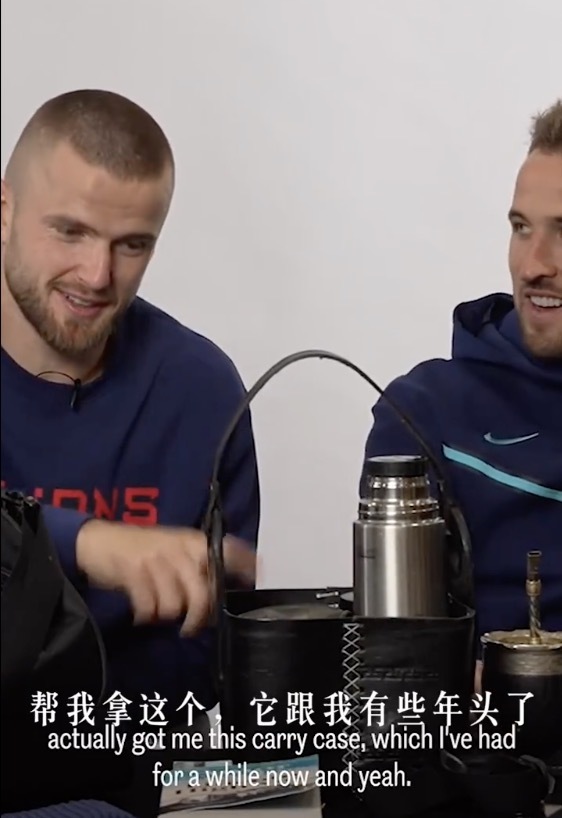 英格兰后卫戴尔向队友凯恩介绍自己的马黛茶“装备”。(图源:网络截图)