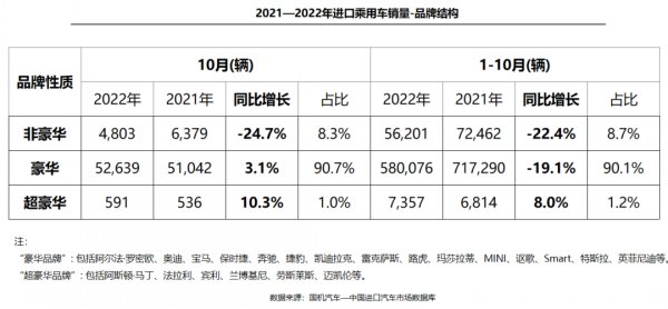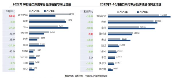 中国汽车流通协会分析,10月数据同比上升,主要原因为去年同期芯片短缺形成的低基数。今年10月进口车市场受疫情反复及消费需求减弱等因素影响,呈现旺季不旺特征。