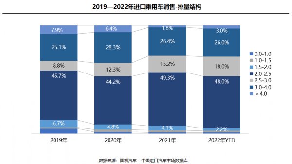 排量方面,1-10月进口乘用车排量在1.5-2.0L中的车型占比为47.9%,相比2021年有所下滑,但仍保持第一大排量区间;2.5-3.0L为第二大排量区间,在保时捷Panamera销量增长带动下,份额较2021年有所提升;一同提升的还有3.0L以上排量区间,受平行进口车型逐步恢复供应影响,份额反弹至5.4%。