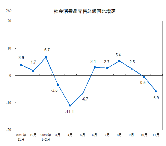 11月份,社会消费品零售总额38615亿元,同比下降5.9%。其中,除汽车以外的消费品零售额34828亿元,下降6.1%。