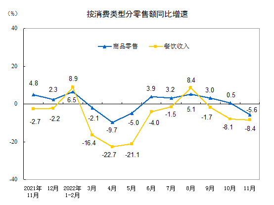 按消费类型分,11月份,商品零售34180亿元,同比下降5.6%;餐饮收入4435亿元,下降8.4%。1—11月份,商品零售359406亿元,同比增长0.5%;餐饮收入39784亿元,下降5.4%。