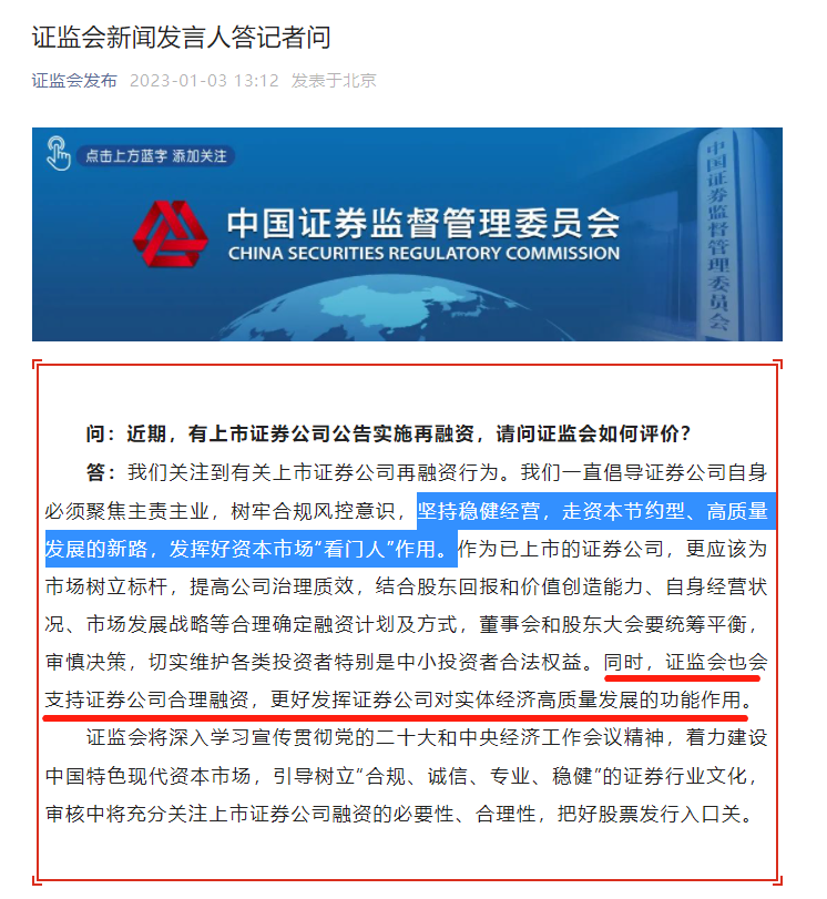 另一方面,证监会还提到,支持券商合理融资,更好发挥券商对实体经济高质量发展的功能作用。着力建设中国特色现代资本市场,引导树立“合规、诚信、专业、稳健”的证券行业文化,审核中将充分关注上市券商融资的必要性、合理性,把好股票发行入口关。