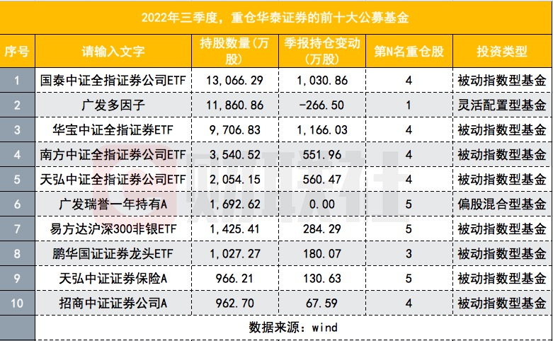 重仓华泰证券前十基金多为指数型产品,国泰中证全指证券公司ETF持有最多,并在三季度进行了加仓,达到1.3亿股,此外,华宝、南方、天泓等中证券指证券ETF同期也进行了不同程度的加仓。