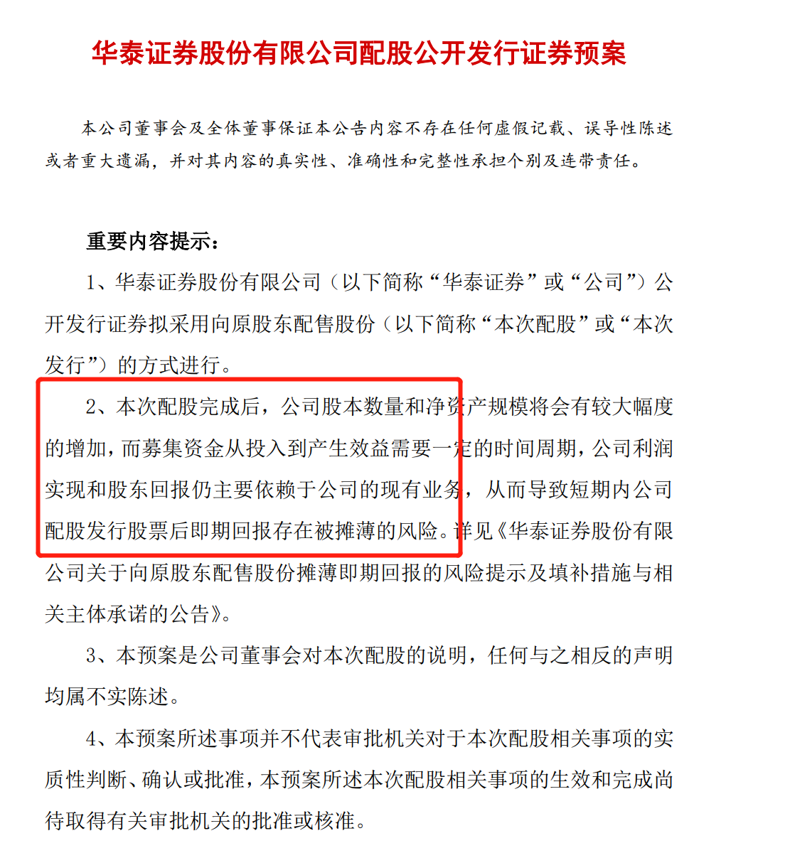 配股带来的风险已经可知。记者注意到,华泰证券在配股预案内提到,此次配股完成后,公司股本数量和净资产规模将会有较大幅度的增加,而募集资金从投入到产生效益需要一定的时间周期,公司利润实现和股东回报仍主要依赖于公司的现有业务,从而导致短期内公司配股发行股票后即期回报存在被摊薄的风险。