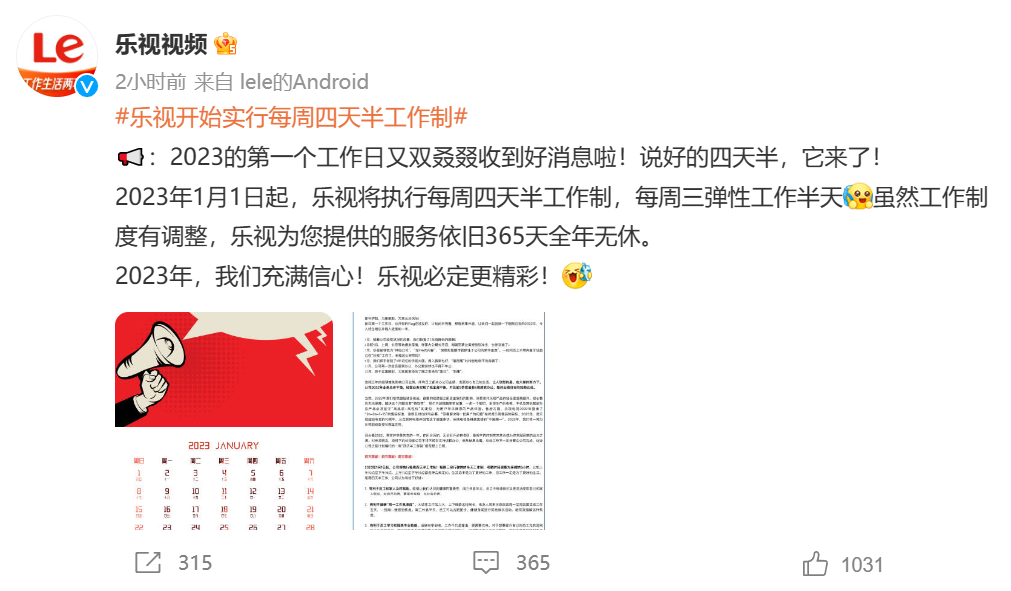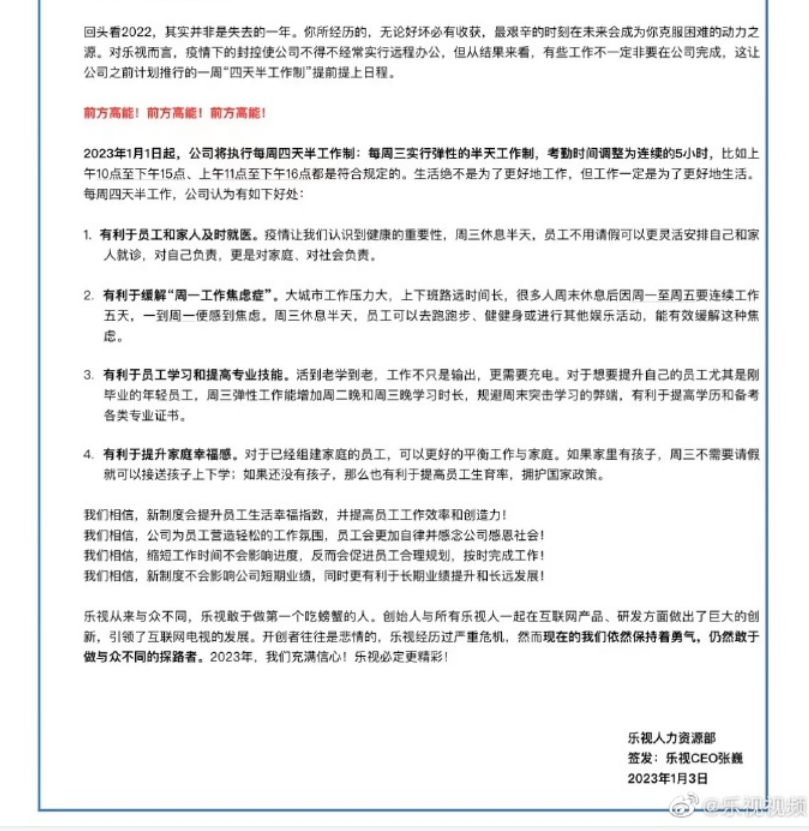 新京报贝壳财经讯 1月3日,乐视视频官方微博宣布,2023年1月1日起,乐视将执行每周四天半工作制,每周三弹性工作半天;考勤时间调整为连续的5小时,比如上午10点至下午3点、上午11点至下午4点都是符合规定的。从乐视视频披露的本次调整内部信件的签发信息来看,“落款”为乐视人力资源部,“签发”则为乐视CEO张巍。