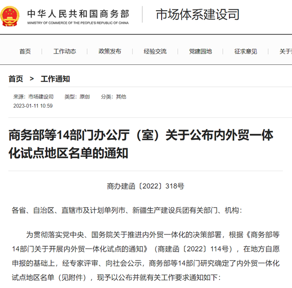 中国网财经1月11日讯 据商务部网站消息,商务部等14部门办公厅(室)发布内外贸一体化试点地区名单,包括:北京市、上海市、江苏省、浙江省(含宁波市)、福建省(含厦门市)、湖南省、广东省(含深圳市)、重庆市、新疆维吾尔自治区。