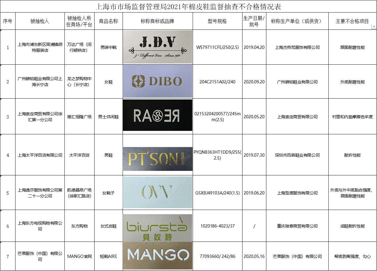上海市市场监管局官方微信号消息,针对消费者投诉、举报集中或以往抽检质量问题较多的产品,近期,市市场监管局集中组织执法力量对万达广场(闵行颛桥店)、龙之梦购物中心(长宁店)、港汇恒隆广场、徐汇太平洋(601099,股吧)百货、凯德晶萃广场(徐家汇(002561,股吧)路店)等14家商场和东方购物、MANGO官网等8家网络交易平台销售的60批次皮鞋进行了监督抽查。