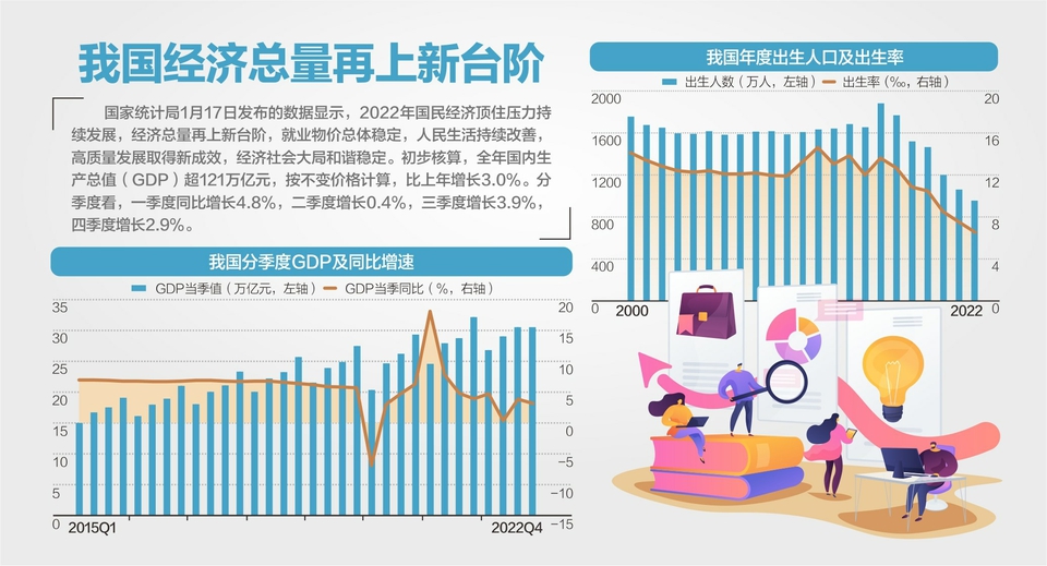 1月17日,国家统计局发布的数据显示,初步核算,2022年全年我国国内生产总值(GDP)1210207亿元,按不变价格计算,比上年增长3.0%。在当日举行的国新办新闻发布会上,国家统计局局长康义指出,2022年我国国民经济顶住压力持续发展,经济总量再上新台阶,就业物价总体稳定,人民生活持续改善,高质量发展取得新成效,经济社会大局和谐稳定。
