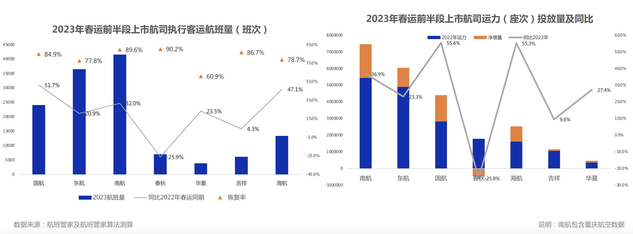 航班管家相关负责人进一步表示,从春运前半段(1月7日-27日)上市航司执行航班量来看,南方航空(600029)(600029.SH)居于首位。同比2022年仅春秋航空(601021)(601021.SH)负增长,同比下降25.9%。但恢复率来看,春秋航空居于首位,恢复到2019年的90.2%,南方航空(89.6%)、吉祥航空(603885)(603885.SH)(86.7%)分别位列第二、第三。从投入运力来看,春秋航空较2022年减少46.3万座次,同比下降25.8%,较2022年运力投放较多的航司分别为中国国航(601111)(601111.SH)(55.6%)、海航控股(600221)(600221.SH)(55.3%)、南方航空(36.9%)。