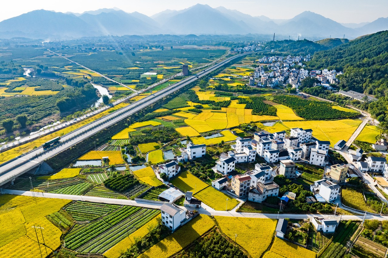 整洁村貌在暖阳的映照下,与高速公路、二级公路、金黄晚稻、绿色果树相映