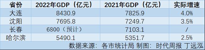 其中,东北地区的4个副省级城市共有大连、哈尔滨和沈阳公布2022年的地区生产总值(下称“GDP”)。长春市的具体数字虽然还在核算中,根据2023年长春市政府工作报告预计的6800亿元,2022年长春GDP仍不敌大连与沈阳。