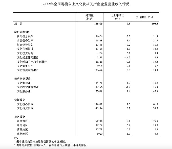中国经济网1月30日讯(记者 魏金金)记者从国家统计局官网获悉,据对全国6.9万家规模以上文化及相关产业企业(以下简称“文化企业”)调查,2022年,文化企业实现营业收入121805亿元,按可比口径计算,比上年增长0.9%。