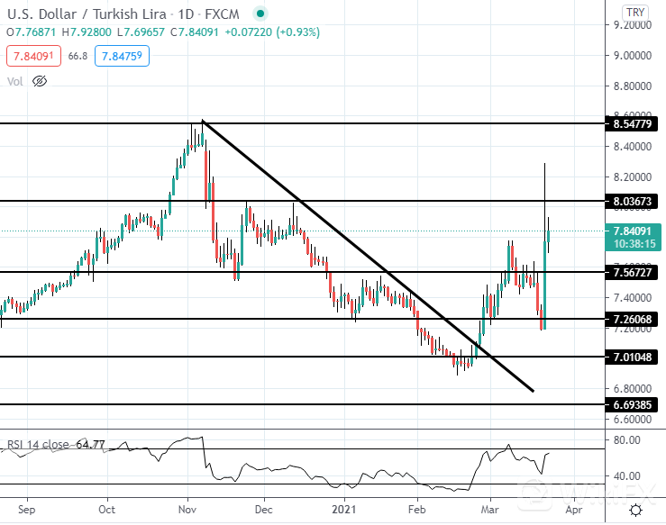 对于土耳其里拉来说,这是一个疯狂的星期,昨天它下跌了15%,之后才将买盘兴趣降至低点,并兑美元汇率逆转了6%。此举背后的驱动力是周末突然意外更换了CBRT州长纳西·阿格巴尔(Naci Agbal)。自去年11月以来,阿格巴尔(Agbal)就一直领导该银行,并因帮助里拉(Lira)摆脱美元兑美元的历史低点而受到许多人的称赞。此外,纳西一直在帮助对抗通货膨胀,尽管通货膨胀率已从近25%的高位回落,但近几个月来有所回升,如今已回升至15%左右。